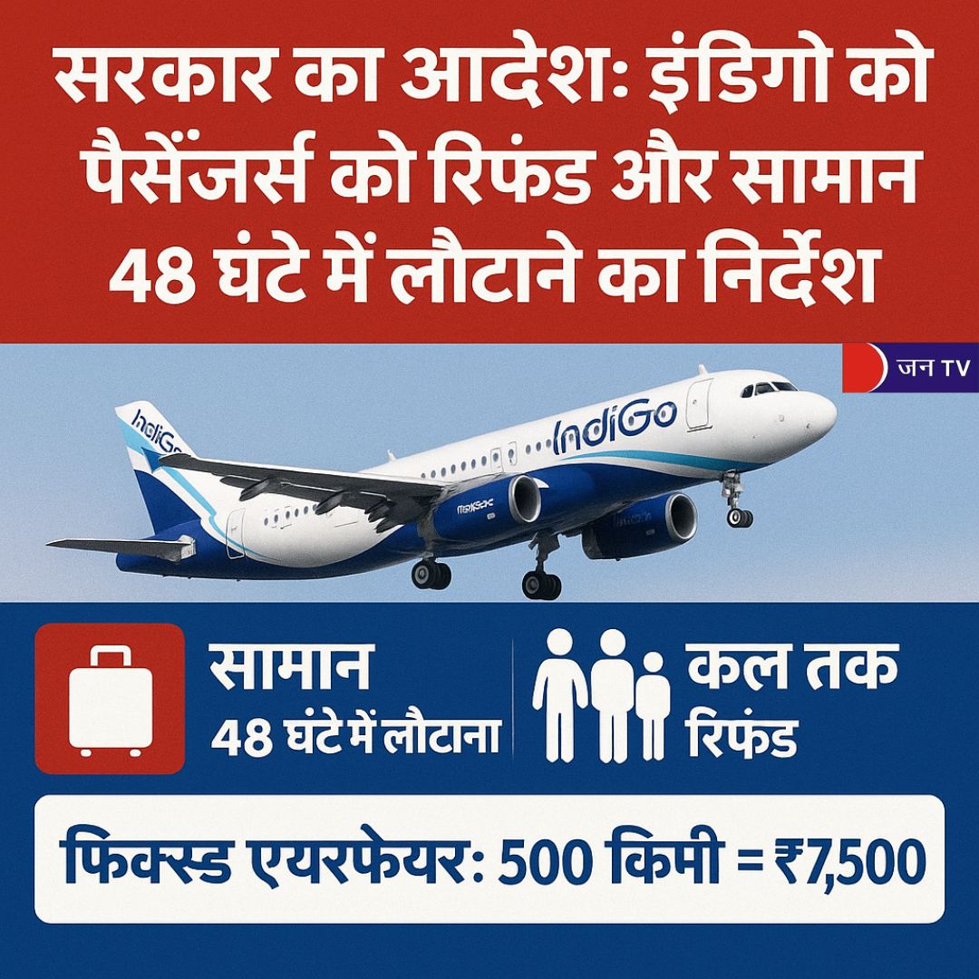 इंडिगो को रिफंड और सामान 48 घंटे में लौटाने का आदेश --- सरकार ने इंडिगो को निर्देश दिया कि पैसेंजर्स को कल तक रिफंड दें और खोया सामान 48 घंटे में लौटाएं। 500 किमी तक की उड़ान का नया किराया ₹7,500 होगा।