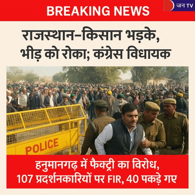 राजस्थान: किसान भड़के, भीड़ को रोका, कांग्रेस विधायक हिरासत में --- हनुमानगढ़ में फैक्ट्री का विरोध तेज हुआ। पुलिस ने 107 प्रदर्शनकारियों पर FIR दर्ज की और 40 लोगों को हिरासत में लिया।
