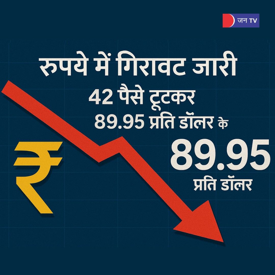 रुपये में गिरावट जारी, 42 पैसे टूटकर 89.95 प्रति डॉलर के अब तक के सबसे निचले स्तर पर पहुंचा --- अंतरबैंक विदेशी मुद्रा विनिमय बाजार में रुपया मंगलवार को 42 पैसे टूटकर अबतक के सबसे निचले स्तर 89.95 प्रति डॉलर पर बंद हुआ। कारोबार के दौरान यह 90 के स्तर पर पहुंच गया था। अर्थशास्त्री आकाश जिंदल ने कहा, "डॉलर के बढ़ने के कुछ सकारात्मक पहलू भी हैं, लेकिन डॉलर की कीमत ज्यादा होने के नकरात्मक पहलुओं से ज्यादा हैं। मुझे उम्मीद है कि डॉलर और बढ़कर 92 रुपये हो जाएगा और यह भारत के लिए नकरात्मक हो सकता है।"