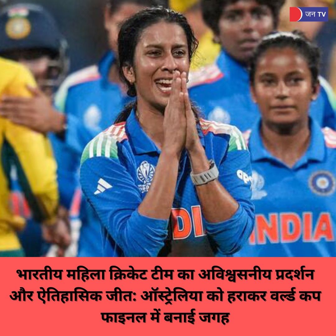 भारतीय महिला क्रिकेट टीम का अविश्वसनीय प्रदर्शन और ऐतिहासिक जीत: ऑस्ट्रेलिया को हराकर वर्ल्ड कप फाइनल में बनाई जगह --- स्मृति मंधाना और प्रतिका रावल ने शतकीय साझेदारी के साथ टीम को मजबूत शुरुआत दी। इस जीत ने भारत को फाइनल में पहुंचा दिया।